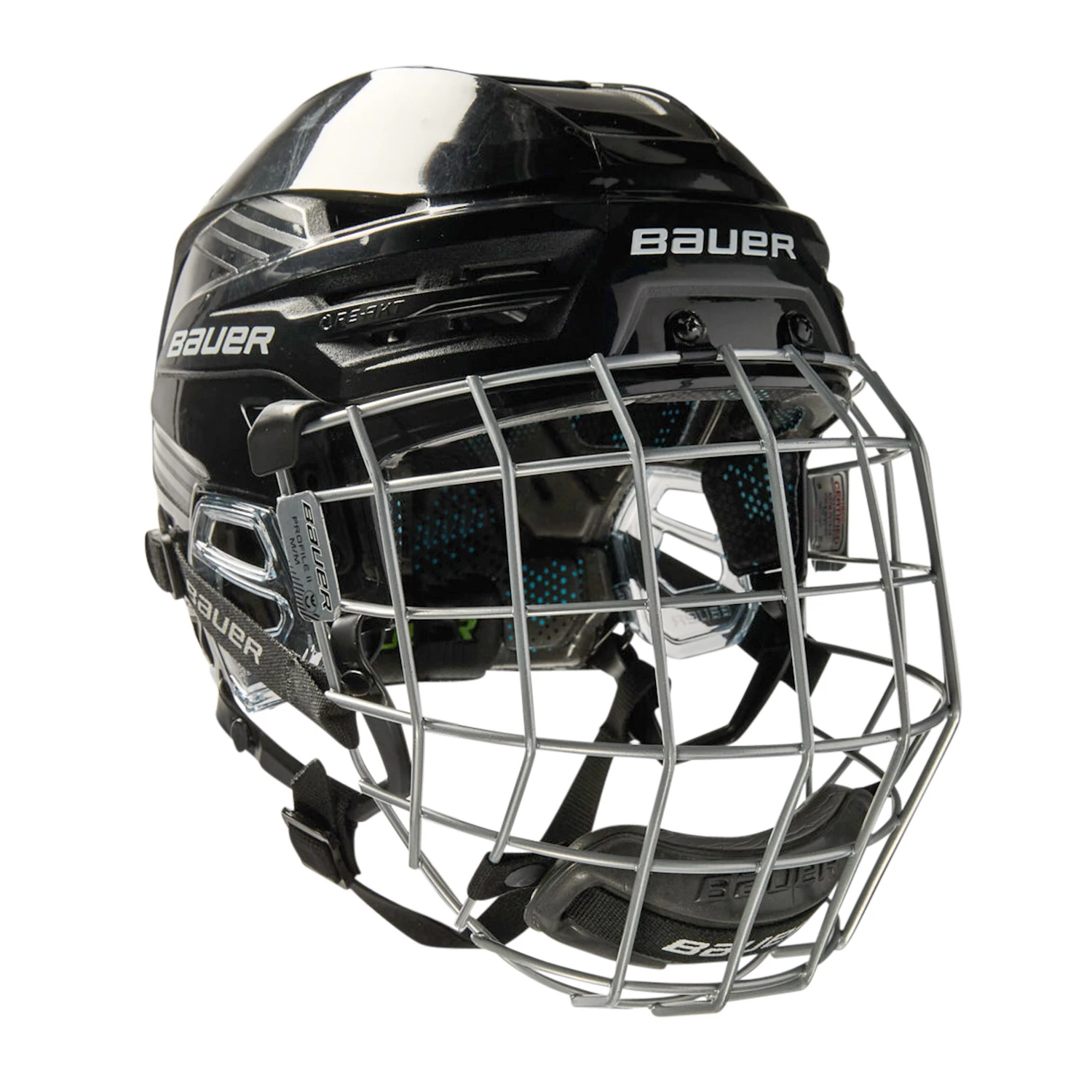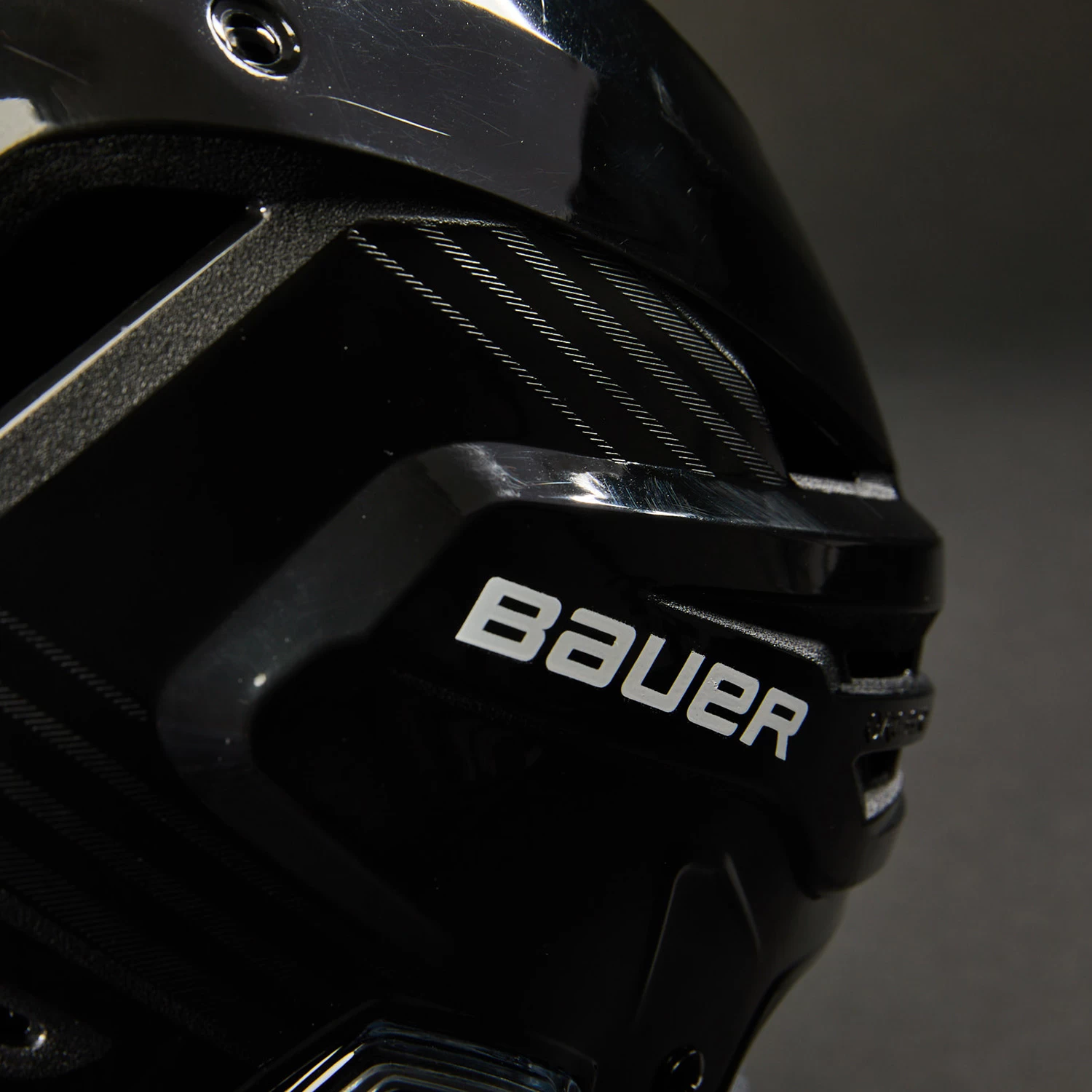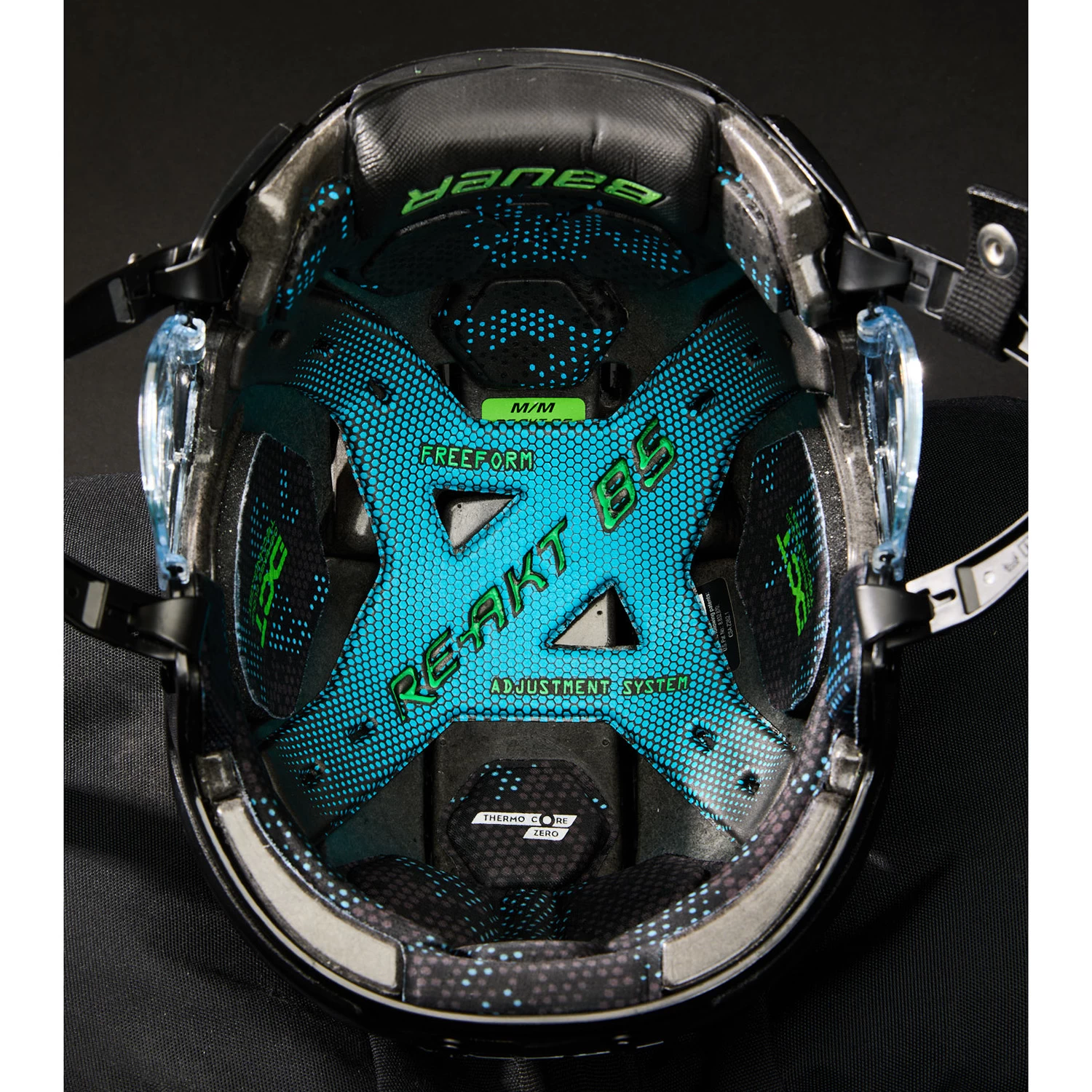 Der Bauer RE-AKT 85 ist ein hochentwickelter Eishockeyhelm (mit Gitter), der einen extrem sicheren und komfortablen Sitz bietet. Sein geformtes Hinterhauptteil passt sich an die Kopfform an und verhindert so ein Herunterrutschen des Helms. Die DCT-Polsterung in Schlüsselbereichen ermöglicht eine verbesserte Schlagabsorption und erhöht den Komfort. Das Thermo Core Zero Polster absorbiert Schweiß, während das Free Form Anpassungssystem die Breite und Länge des Helms individuell einstellen lässt.