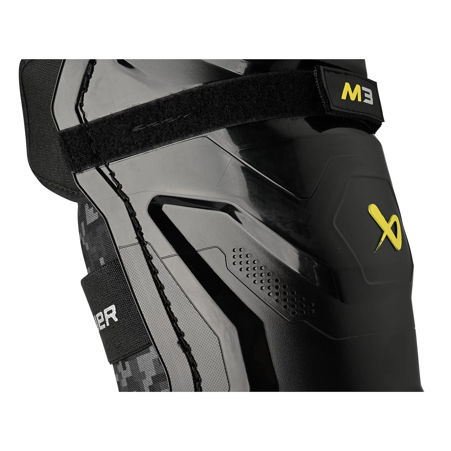 Der Bauer Supreme M3 Beinschutz ist der perfekte Begleiter für Eishockey- und Freizeitspieler. Der X-Flex Schienbeinschutz ist beweglich und gibt dem Spieler daher die Möglichkeit, schneller auf den Schlittschuh treten zu können. Die Ergo Dynamic Kniekappe sorgt für einen tieferen Sitz und somit für eine bessere Passform. Dank der Komfort- und Wadenstraps bleibt der Schoner stabil und rutscht während des Spiels nicht. Das Futter ist aus Thermo Max, einem atmungsaktiven und angenehmen Material, welches für besten Tragekomfort sorgt.