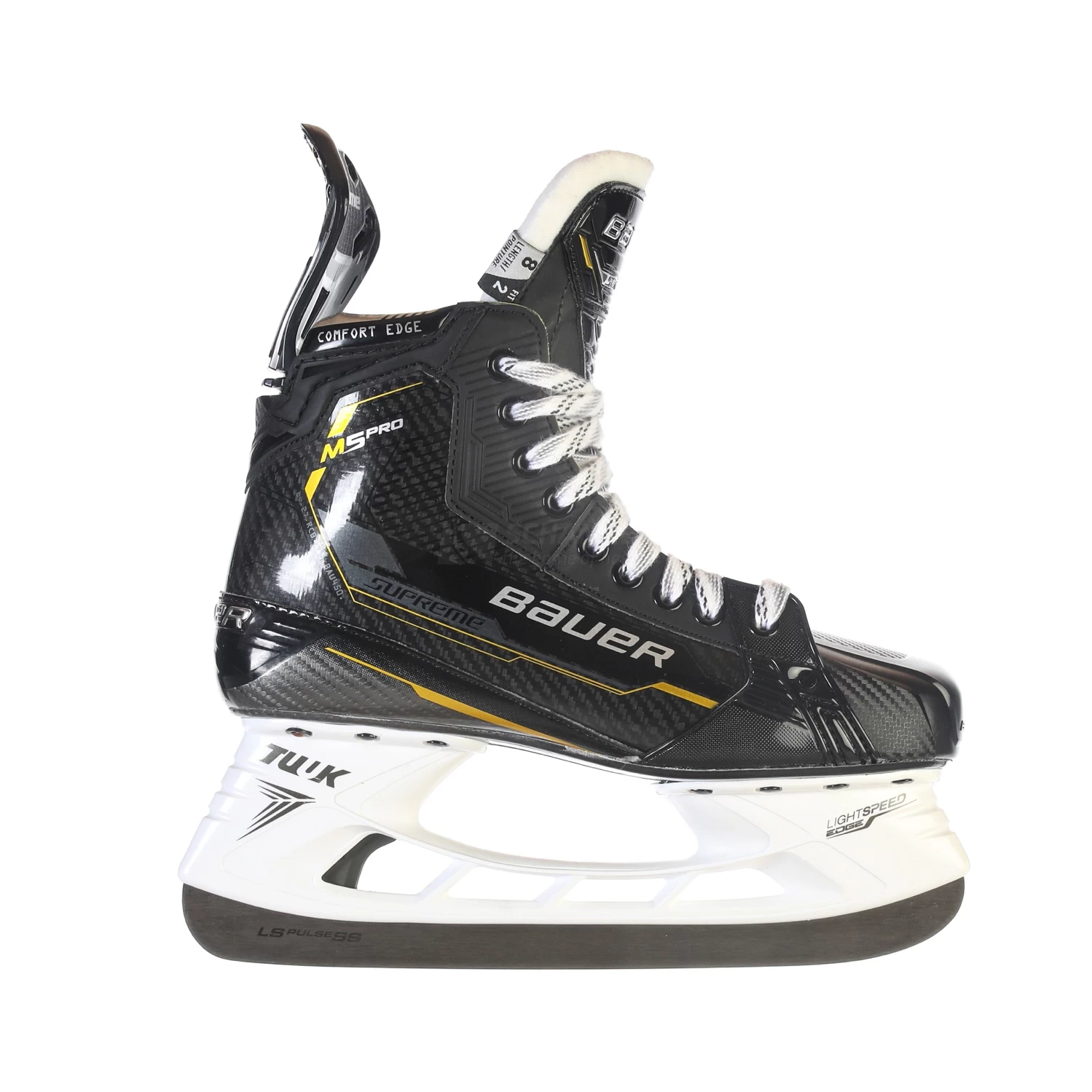 Der Supreme M5 Pro Skate ist für den Elite und Performance Spieler mit etwas mehr Komfort und mit dem neuen Performance Fit System ausgestattet. Das hochwertige und leichte Carbon Curv Composite Materiel zusammen mit der Pro TPU Außensohle sorgen für mehr Steifigkeit, Kraftübertragung und Geschwindigkeit. Die neue Passform bietet zusätzlichen Halt für optimale Stabilität des Fußes und ermöglicht einen kraftvolleren Abstoß. Die 48 oz. Filzzunge mit extra Mittelfußschutz sorgt für besten Vorwärts-Flex und Tragekomfort. Die Pulse SS Edelstahlkufe mit BAUER Powerprofil überträgt die Geschwindigkeit noch besser.