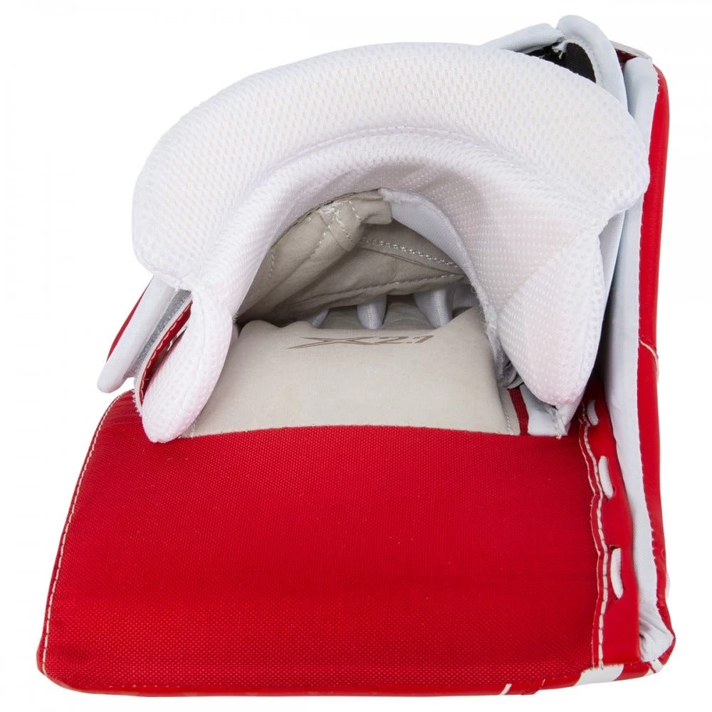 Schließlich wurde an der Manschette des Vapor X2.7 Senior-Blockers Aerolite verwendet, um eine Schutzmanschette zu erstellen, die eine große Bewegungsfreiheit bietet, damit der Torwart seine Hand auf den Schützen richten und bessere Winkel zum Umleiten von Pucks in die Ecken schaffen kann .